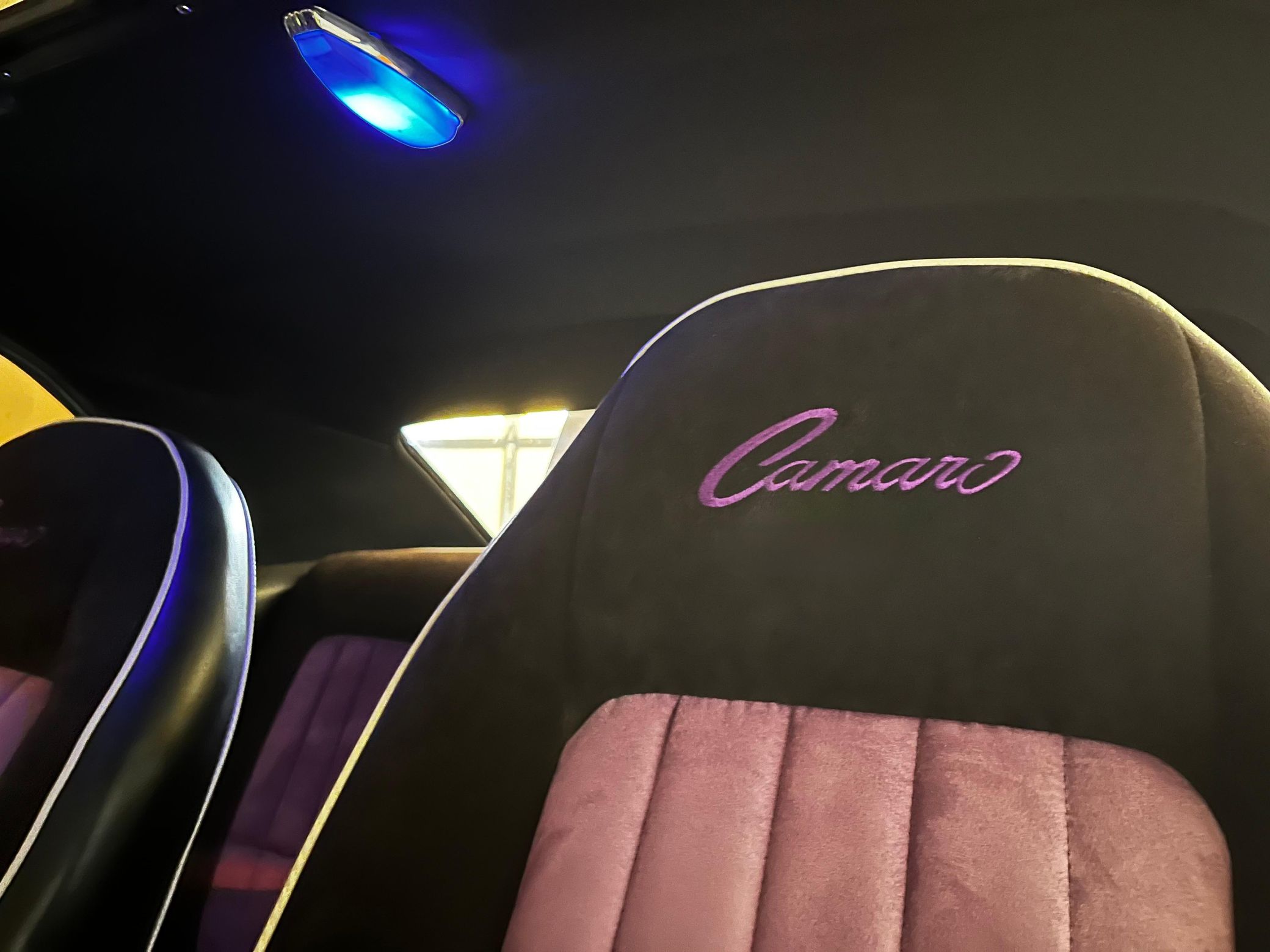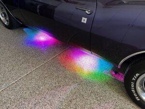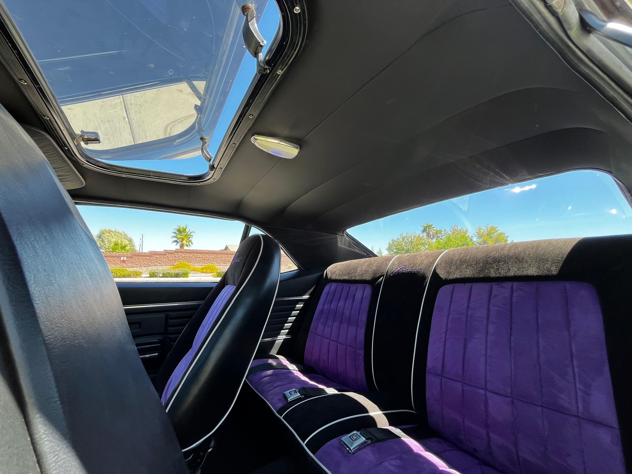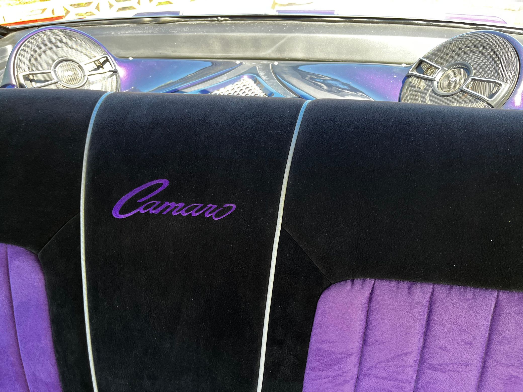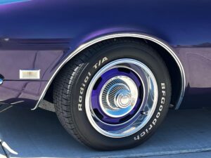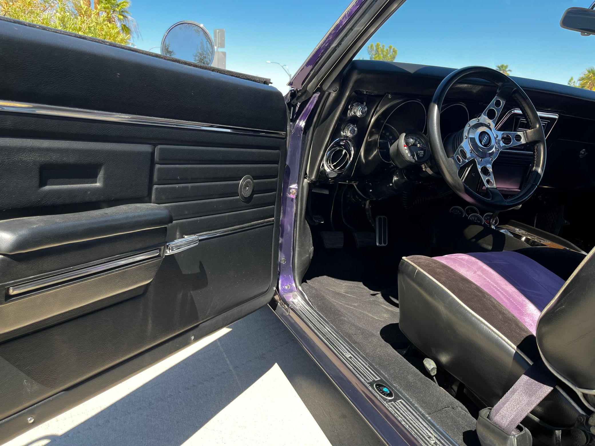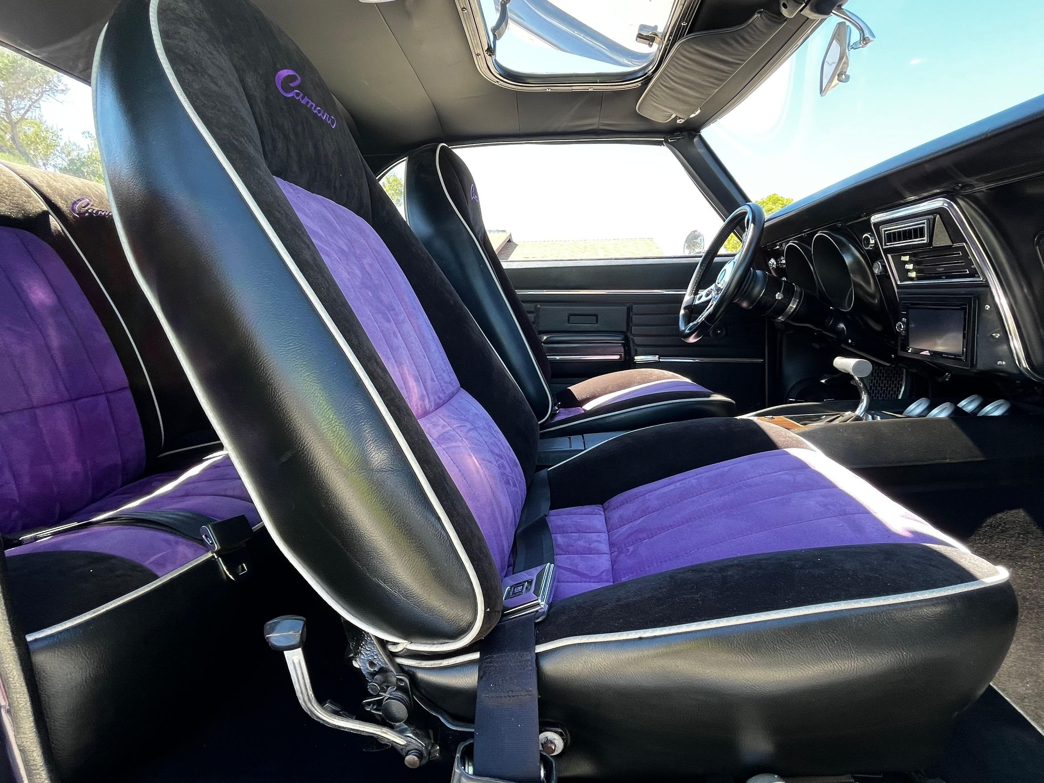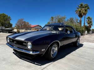 This 1968 Chevrolet Camaro Coupe is finished in a custom purple and silver two-tone exterior over a black and purple interior. It is reported to have undergone a body-off restoration and remains in excellent driving condition.