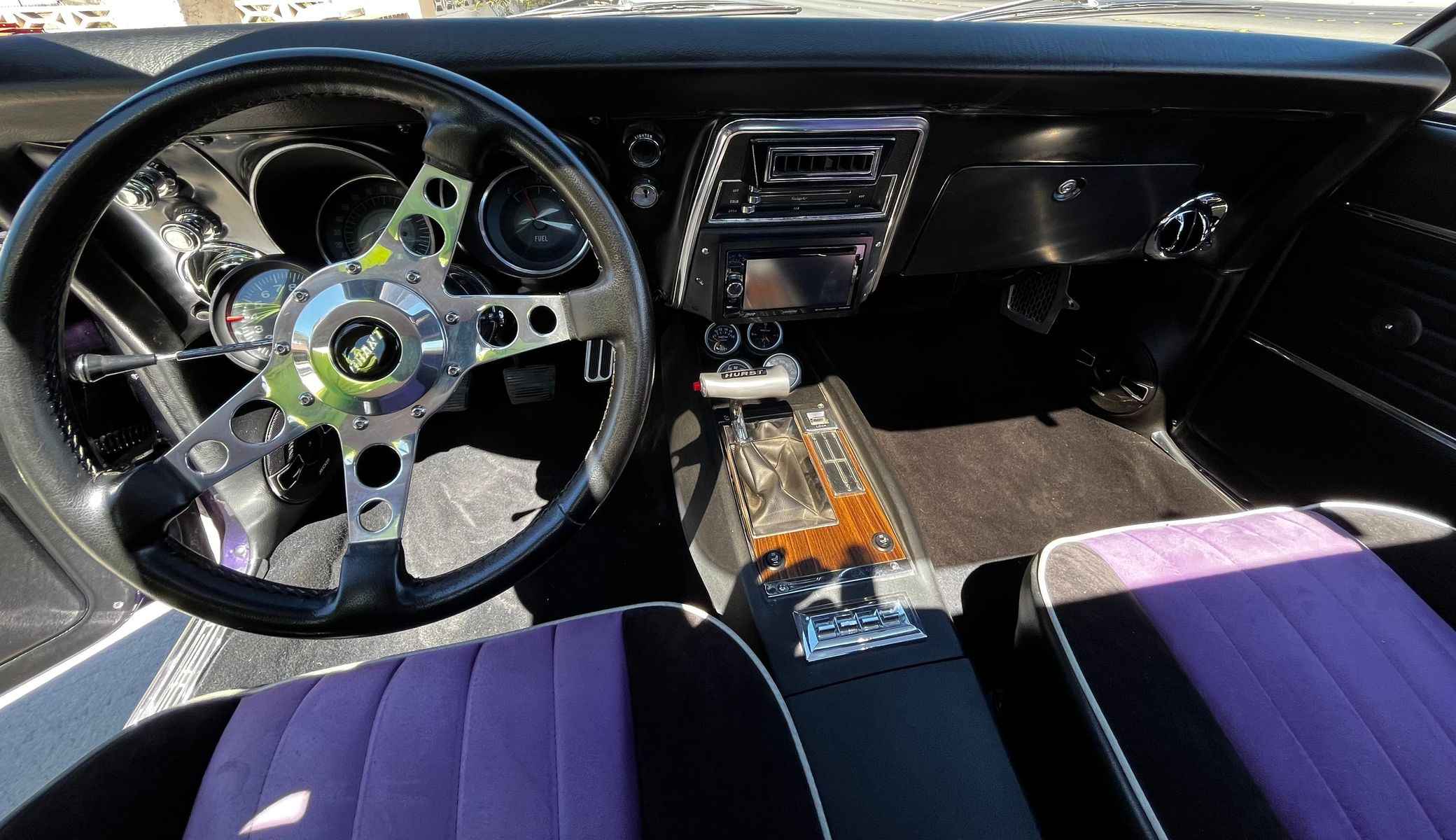 The car has been extensively customized, with features including heated front seats, a removable sunroof, Vintage Air A/C, and a Kenwood touchscreen system with KICKER subwoofer and speakers. This example blends classic muscle car styling with modern comforts and flair, ideal for collectors or show enthusiasts seeking a standout restomod.