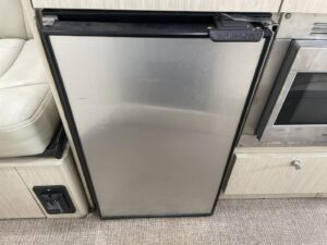 The exterior paint and graphics show minimal wear, the interior is clean and well-preserved, and all systems (A/C, electrical, water, appliances) are fully operational.