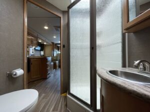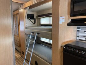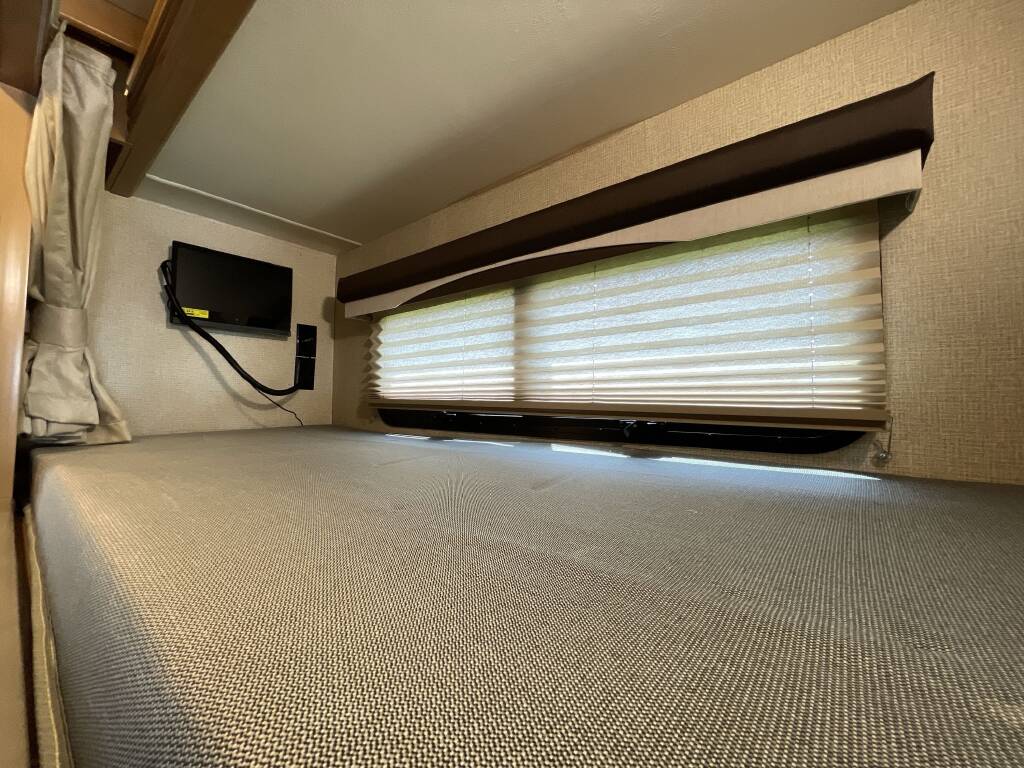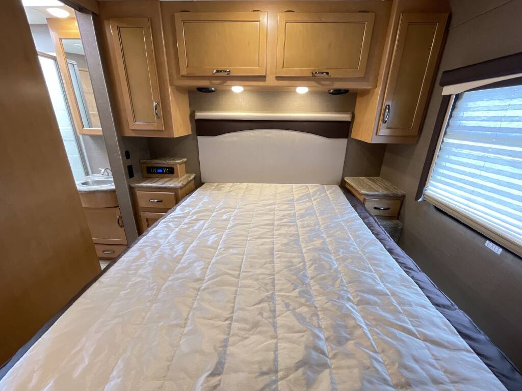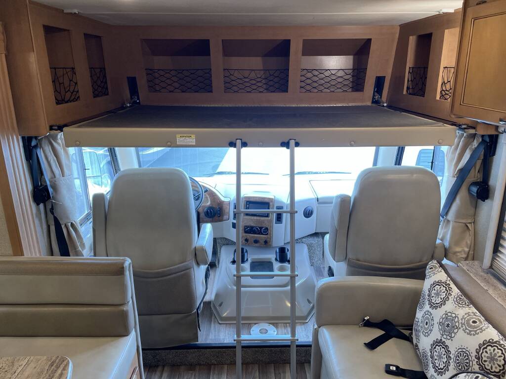 Sleeping Setup: Rear Queen Bed, Overhead Power Bunk, Double Mid Bunks, Leather Sofa Sleeper, Convertible Dinette