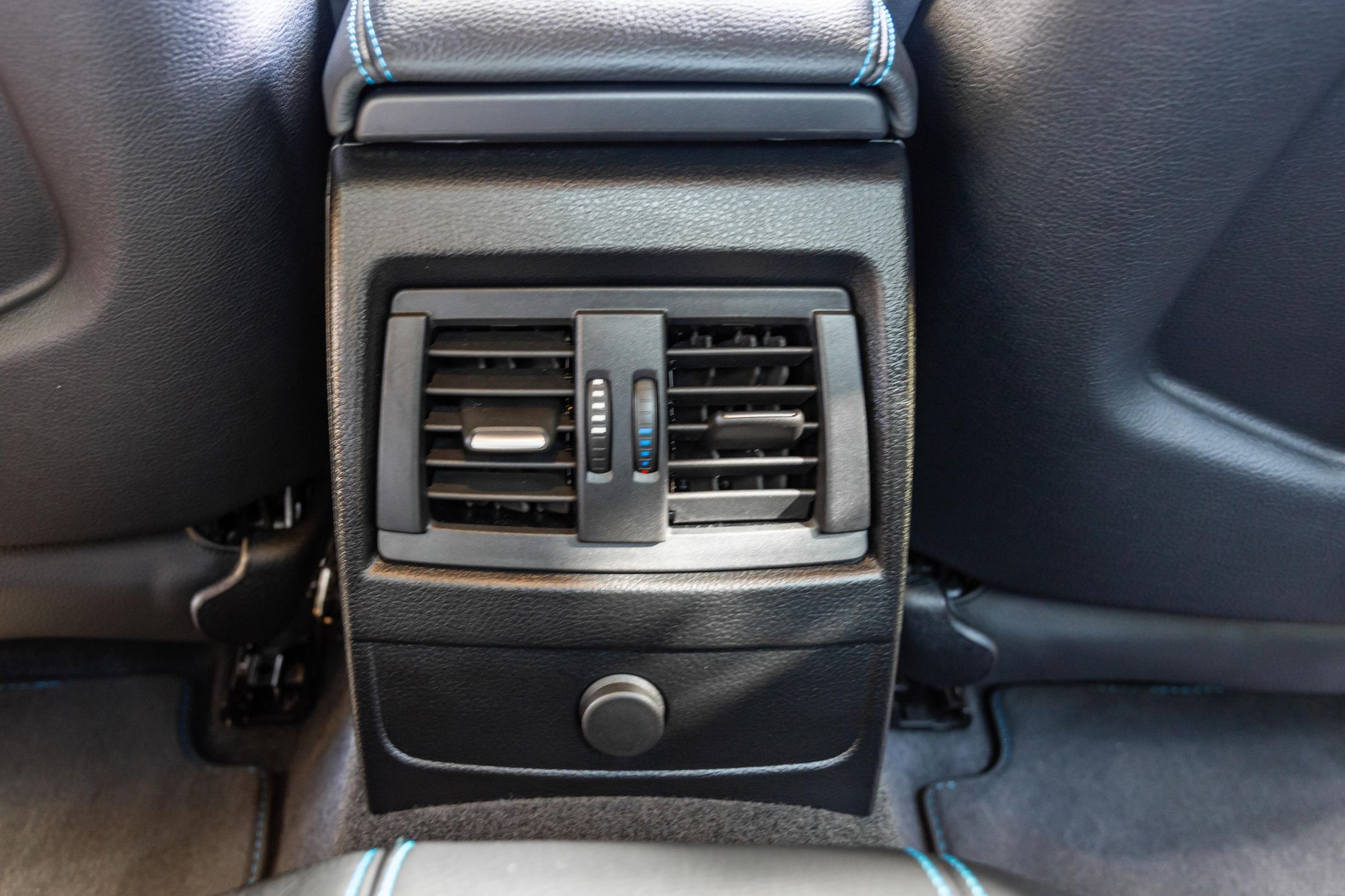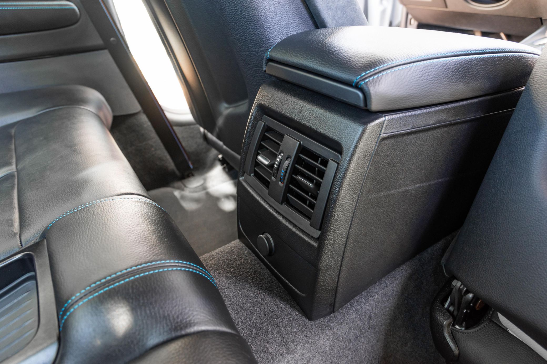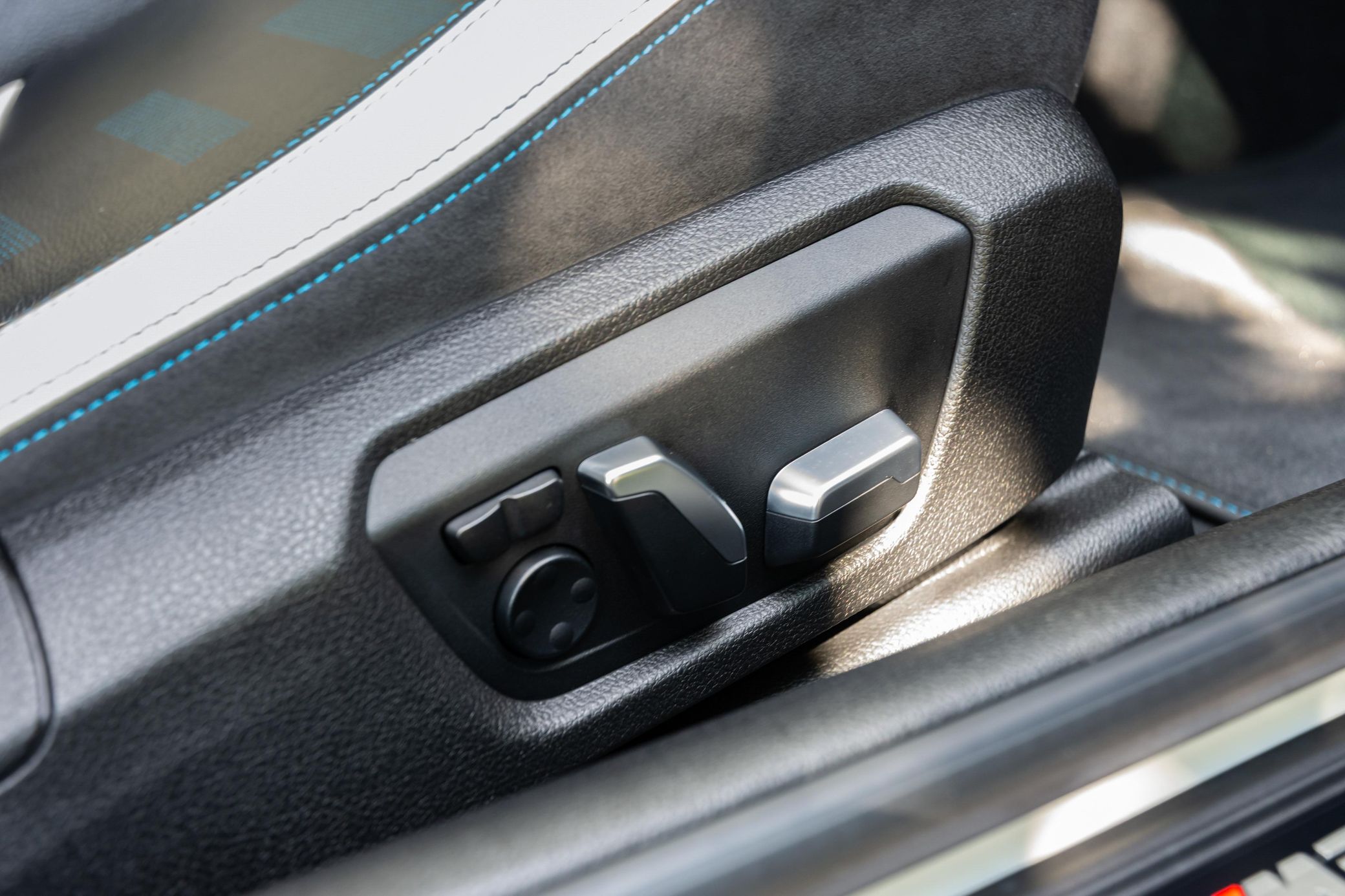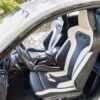 Dakota leather upholstery with silver/black highlights and blue stitching