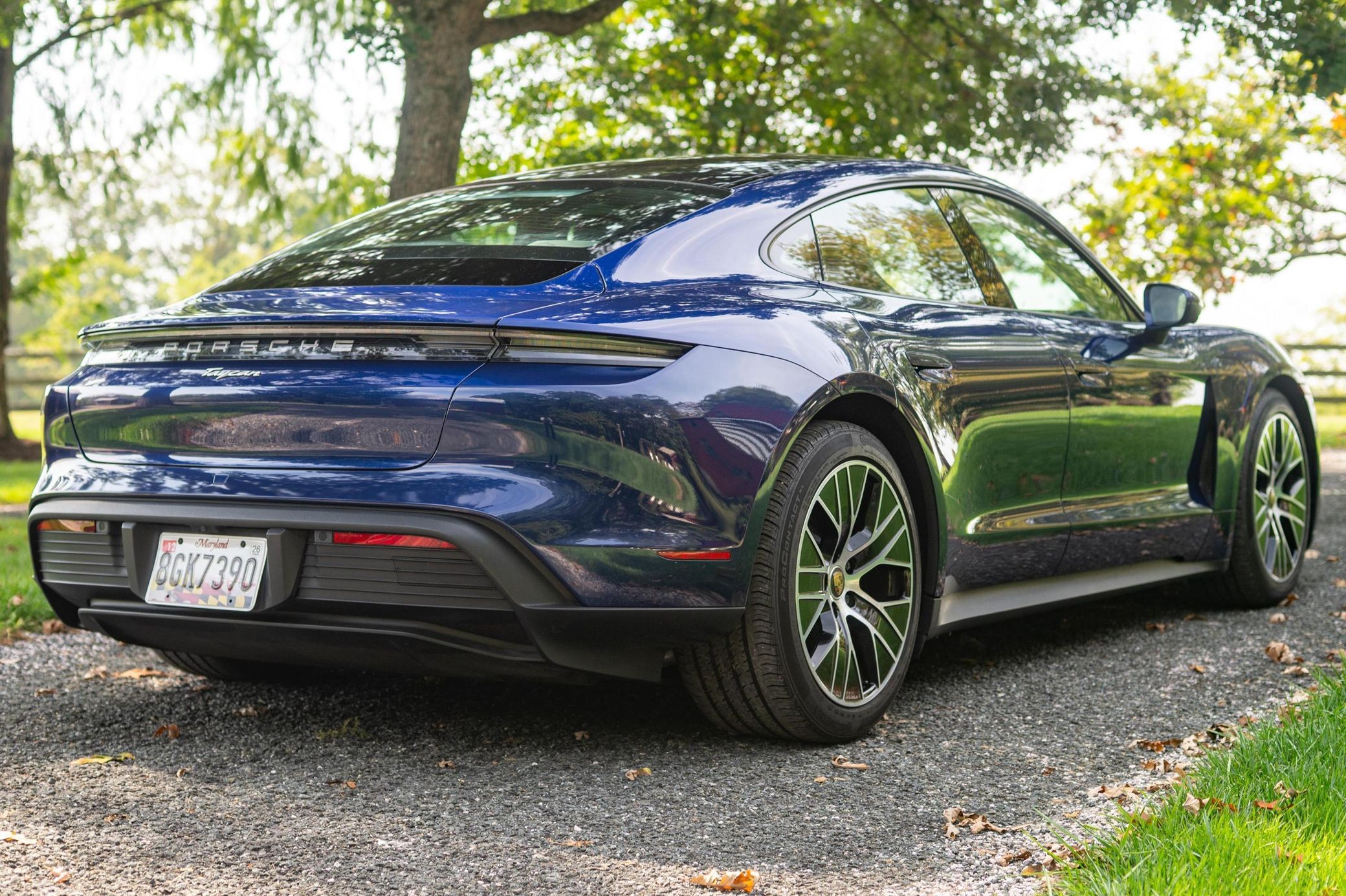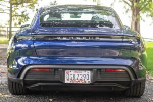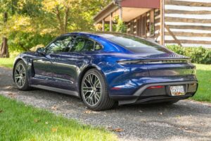 Power comes from a single electric motor on the rear axle, producing up to 402 horsepower and 254 lb-ft of torque, fed by a 79.2-kWh lithium-ion battery pack. The Taycan delivers an EPA-rated range of approximately 200 miles on a full charge.