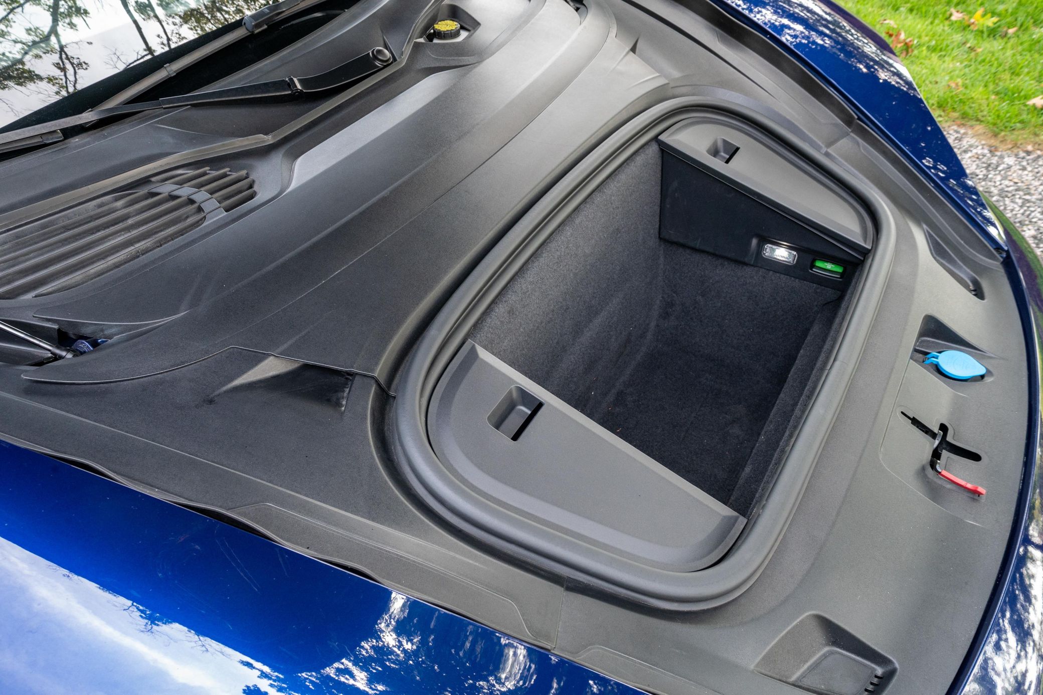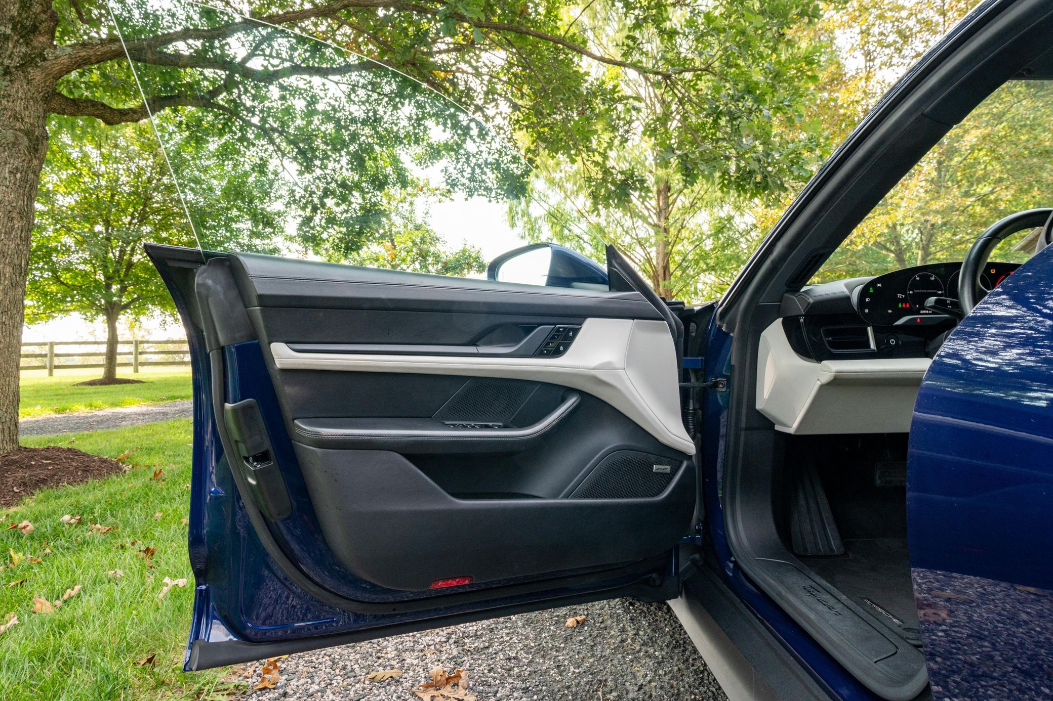 This 2021 Porsche Taycan is finished in Gentian Blue Metallic over a Chalk leather interior, showing 24,000 miles. It is powered by a single rear-mounted electric motor paired with a 2-speed automatic transmission, and comes with a clean Maryland title. The included Carfax report shows no mileage discrepancies and lists only minor cosmetic damage in October 2023.